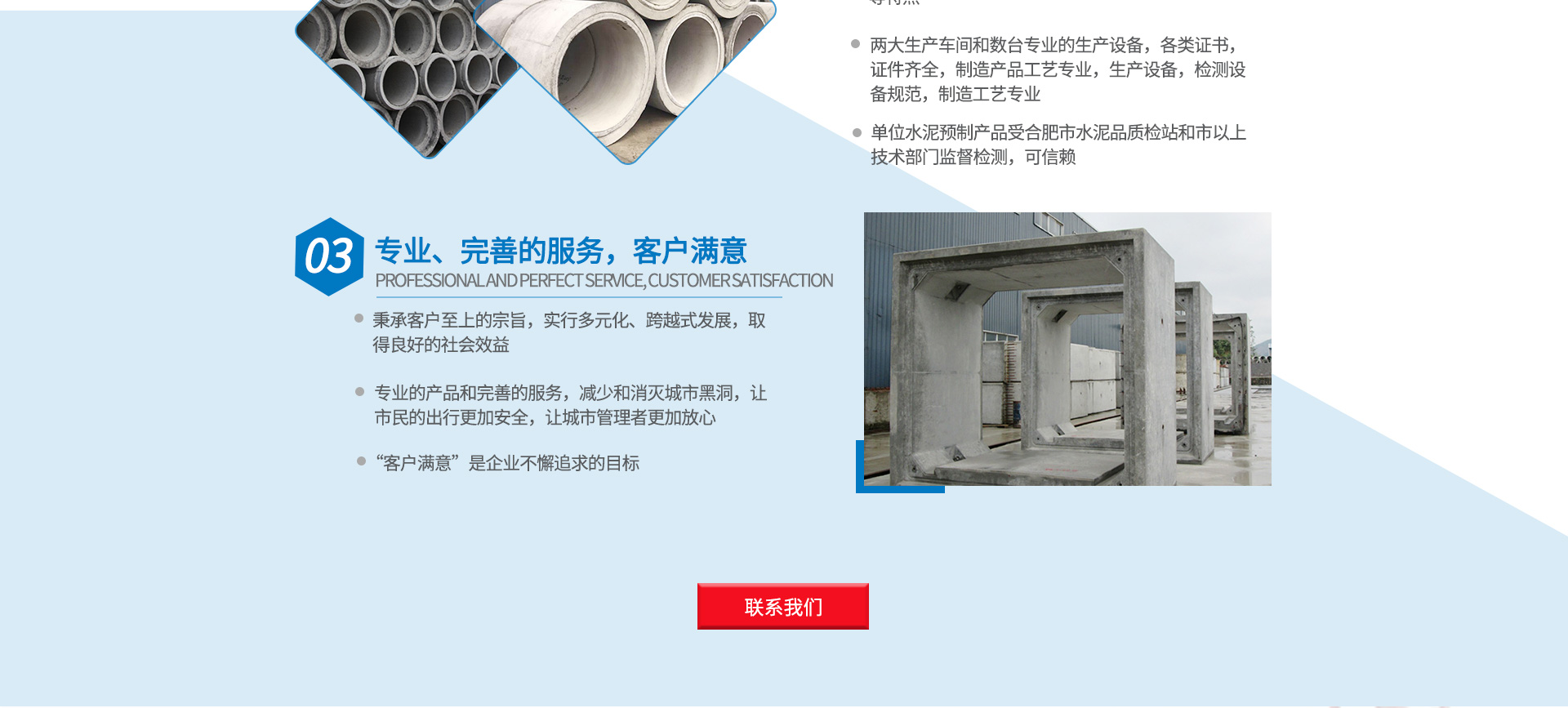 安徽砼宇特構科技有限公司創建于2005年10月,注冊資本3000萬元注冊資金,總部位于安徽省蕪湖市省級裝配式建筑產業園區。是一家以生產混凝土排水管、檢查井、箱涵、住房裝配化及異型砼構件為主的高新技術企業。生產基地占地60000㎡,現有員工90多人,中、高等級職稱技術人員20多人,具有試驗室,嚴格控制產品質量,使產品出廠合格率高。 公司共取得了國家發明4項,實用新型發明9項,受理發明9項,安徽省科技成果1項,安徽省高新技術產品5項,安徽省科技新產品5項,是安徽省專精特新中小企業、蕪湖市科技創新“小巨人”企業,參與制定建材行業標準3項《預制混凝土檢查井》JC/T 2241-2014)、GB/T11836《混凝土和鋼筋混泥土排水管》、行業《預制裝配化混凝土箱涵》標準的制定。是安徽省內水泥制品砼構件和排水管行業的創新型企業。 公司具有建筑工程施工總承包二級、下設的全資子公司(全一建設)具有市政三級資質。同時我公司從事城市園林綠化、市政公用工程...